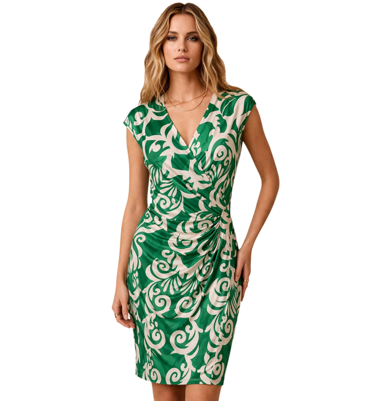 Klasszikus szabású, mintás átlapolt jégselyem ruhakészletenszín: zöldminta: indák