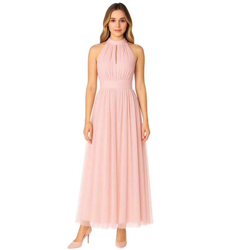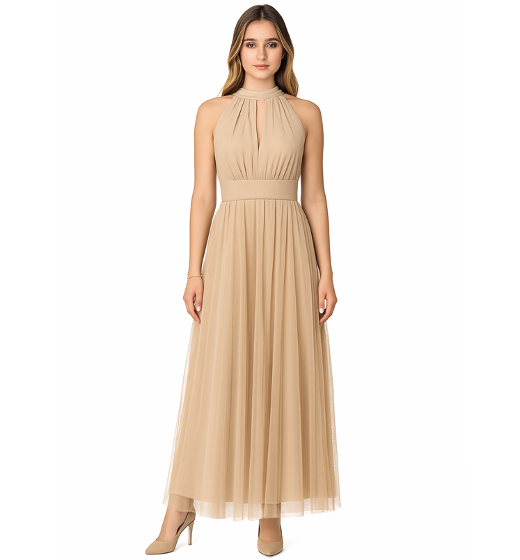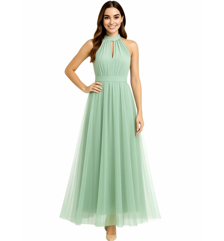 Különleges emelt nyakú dekoratív muszlin ruha. Szoknya része dupla, kívül lágy esésű tüll borítja, mely 5 cm-rel hosszabb, mint a belső szoknya. Háta nem túlságosan mély, V-kivágású, a melltartót takarja. Elasztikus, a derekán saját anyagú övvel köthető. Mell része belül szivacsos, de ez egy kis kreativitással könnyen eltávolítható. A ruha teljes hossza 105+5 cm, mellbősége 80-100 cm, a derékbősége pedig 65-85 cm.