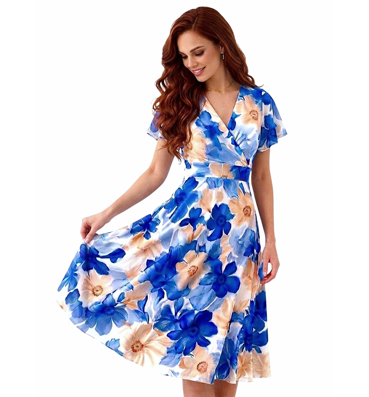 Mintás, rövid ujjú átlapolt, hátul gumis ruhanincs készletenszín: fehérminta: királykék virágok
