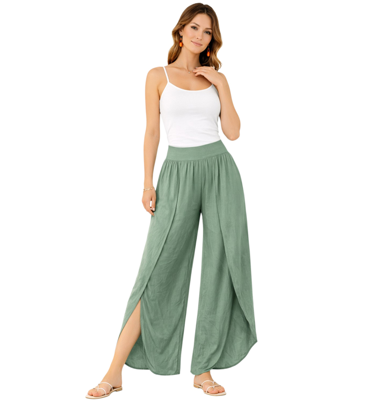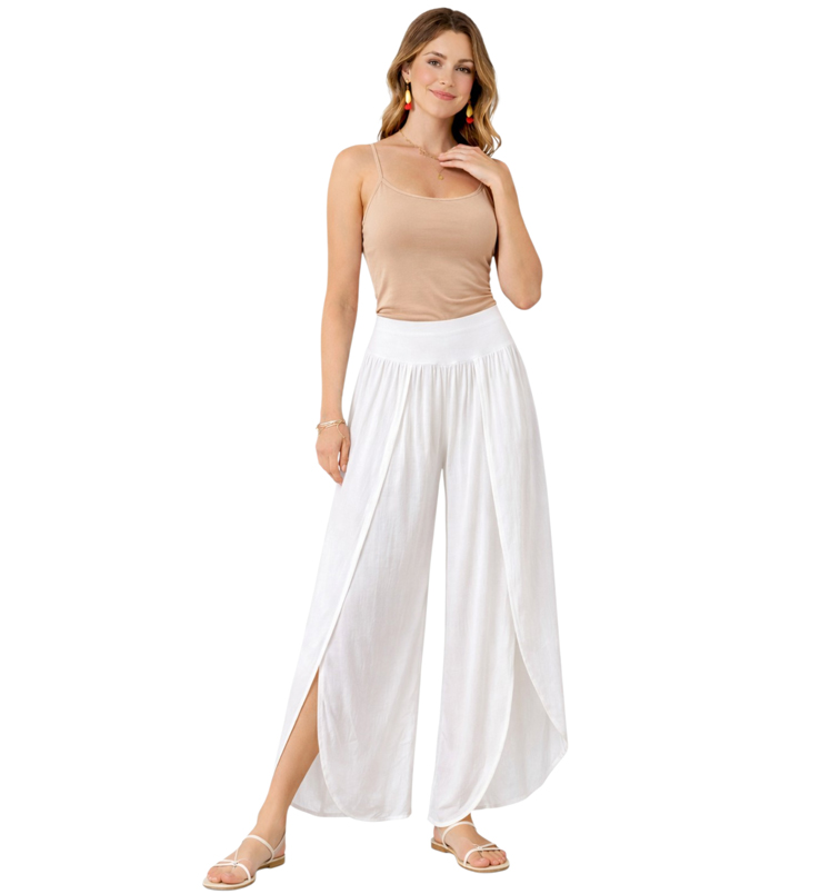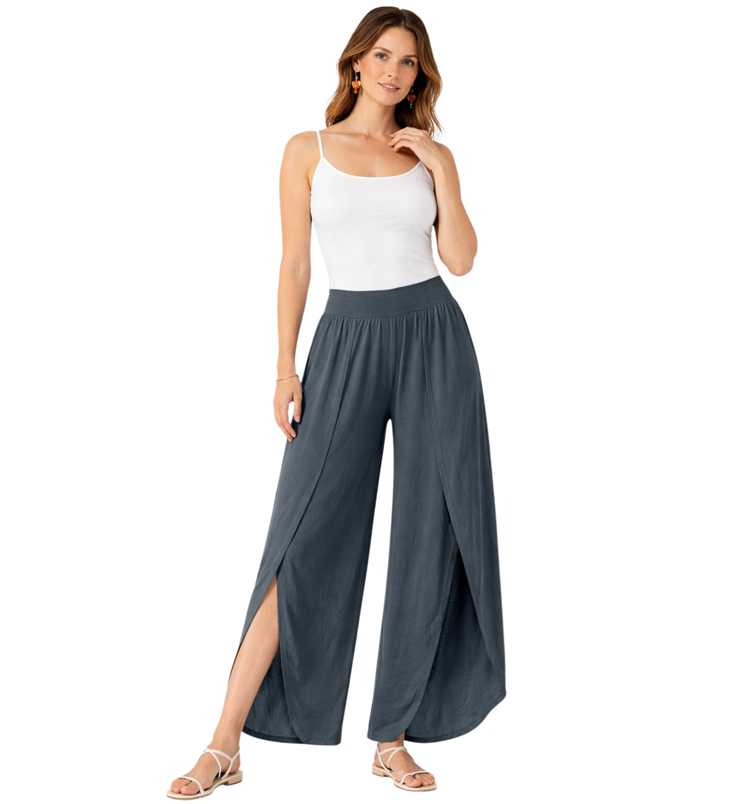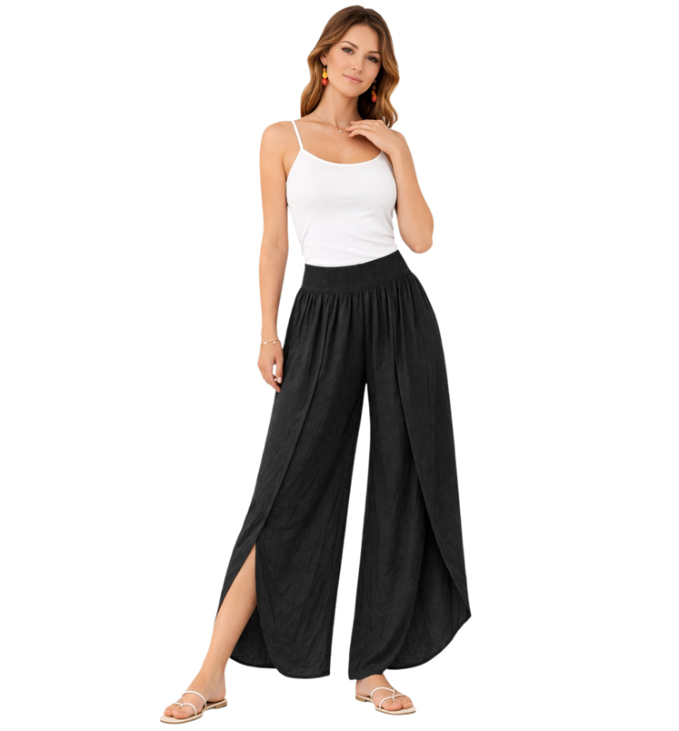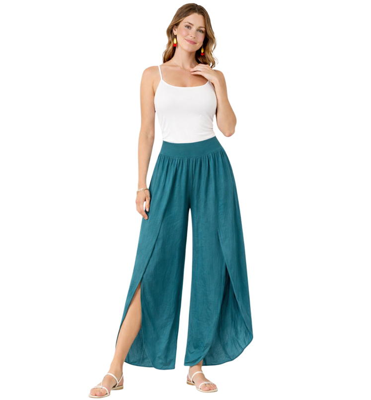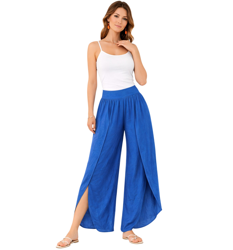 Különleges, lezsert fazonú nadrág, derékban elasztikus pamut passzés kialakítással. Puha, lágy esésű, kellemes tapintású, vékony viszkóz anyagának köszönhetően kényelmes viselet, amely szépen követi a mozgást. Oldalt átlapolt, térdtől nyíló szára modern, nőies ás trendi megjelenést biztosít. Beépített belső pamut shorttal ellátott, így komfortos viselet. Igazi nyári alapdarab! A nadrág derékbősége 80-100 cm, csípőbősége 100-125 cm, belső szárának hossza pedig 72 cm.