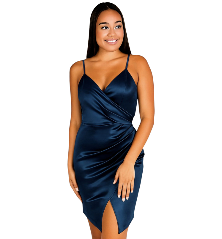 Elegáns, testhezálló fazon átlapolt V-kivágással és elöl sliccelt szabással. Fényes, lágy esésű, enyhén elasztikus szatén anyagból készült ruha, amely kiemeli viselője alakját.