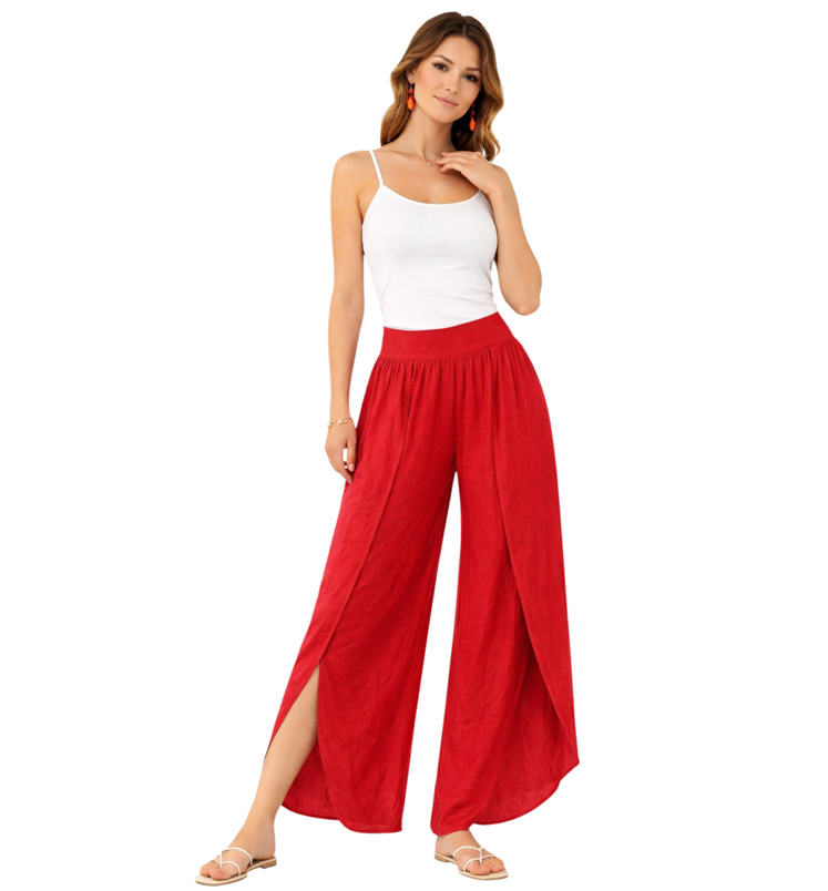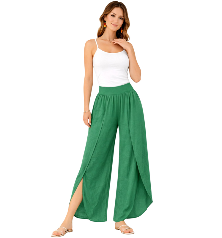 Különleges, lezsert fazonú nadrág, derékban elasztikus pamut passzés kialakítással. Puha, lágy esésű, kellemes tapintású, vékony viszkóz anyagának köszönhetően kényelmes viselet, amely szépen követi a mozgást. Oldalt átlapolt, térdtől nyíló szára modern, nőies ás trendi megjelenést biztosít. Beépített belső pamut shorttal ellátott, így komfortos viselet. Igazi nyári alapdarab! A nadrág derékbősége 80-100 cm, csípőbősége 100-125 cm, belső szárának hossza pedig 72 cm.